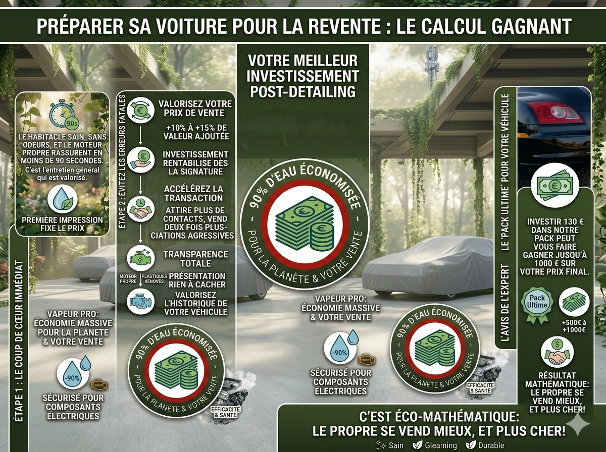 Valorisez votre prix de vente : Une voiture préparée professionnellement se vend en moyenne 10 % à 15 % plus cher. Le coût d'un pack de detailing est ainsi largement rentabilisé dès la signature de l'acte de vente.
